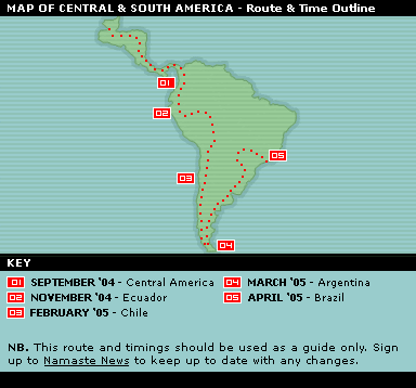 October 2004 – The Expedition travelled south through Central America from Guatemala to Costa Rica, through El Salvador, Honduras and Nicaragua, exploring both inland and along both coasts. From the ancient Mayan city of Copan to the crystal Caribbean waters of the Bay Islands; from delightful colonial towns to amazing active volcanoes... See the October 2004 Namaste News for more info and pictures...