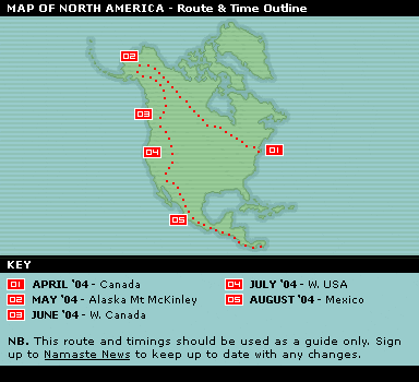 The Expedition completed the North America leg on 25th September 2004, covering a total of 19,820 miles in 173 days through Canada, the USA and Mexico. See below for a month by month account of this incredible journey…and download the newsletters to see stories and pictures from the Expedition.